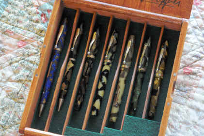 On the right, the box, half open with my Ford's pen, pencil, and combo collection. You can see two of the magnets on either side of the box. Below, left, the box, fully open and empty. I added the felt lining on the sides of the built-in dividers and in the bottom of the box. Below, right, the box open with my Ford's collection. |
