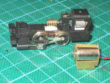 | My newest project is a Chivers conversion of a Bachman N Scale 0-4-0 into a Baldwin HOn30 0-4-0. I started by replacing the stock open frame Bachman motor with a can motor conversion from Nigel Lawton in the UK. These two pictures show the Bachman chassis, first with the Bachman motor installed and the Lawton remotoring kit built up and ready to receive the worm from the Bachman, second with the Lawton unit set in place, still awaiting the worm. | |