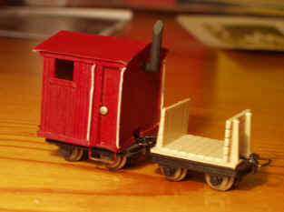 | At the time I started this site, the rolling stock on the layout consisted of a 1960s AHM Minitrains set. That set included a Plymouth diesel loco, two flat cars with bulkheads, and two skips. I built the caboose below on one of the flat car chassis way back when I bought the set (in the 60s). It was my interpretation of the standard gauge Kadee Logging Caboose offered at that time. | |