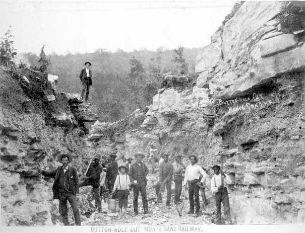 Layout concept or theme For most of the past 40 years, I have lived in Huntsville, Alabama. Back in the late 1800s, a resort hotel was build atop Monte Sano Mountain, which is on the east side of the town. The Huntsville Belt Line and Monte Sano Railroad was built to transport visitors up the mountain to the hotel. The Monte Sano Railroad was a standard gauge affair with a single 26 ton Baldwin steam dummy engine, and its primary rolling stock was a few passenger cars and one or more gondolas for hauling rock. I have some photos of the railroad under construction, when cuts were being made thru the rock of the mountain; and, at that time, the little loco was hauling building materials and crushed gravel for the ballast. The photo below shows the most spectacular part of the railway, a loop called O'Brien's Buttonhole. In this picture, the roadbed enters from downhill at about 12:00, loops left across the great trestle, crosses left to right in the foreground, exits the picture at about 5:00, re-enters about 3:00, and finally exits headed uphill at about 1:00. There is a second, smaller trestle just out of the picture to the right. It does not take too much imagination to transform this open loop into a closed loop for a micro layout; and that is what I intend to do. You will be able to see and judge my success for yourself. |