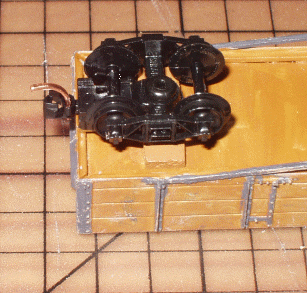 | At the time I started this site, the rolling stock on the layout consisted of a 1960s AHM Minitrains set. That set included a Plymouth diesel loco, two flat cars with bulkheads, and two skips. I built the caboose below on one of the flat car chassis way back when I bought the set (in the 60s). It was my interpretation of the standard gauge Kadee Logging Caboose offered at that time. | |
